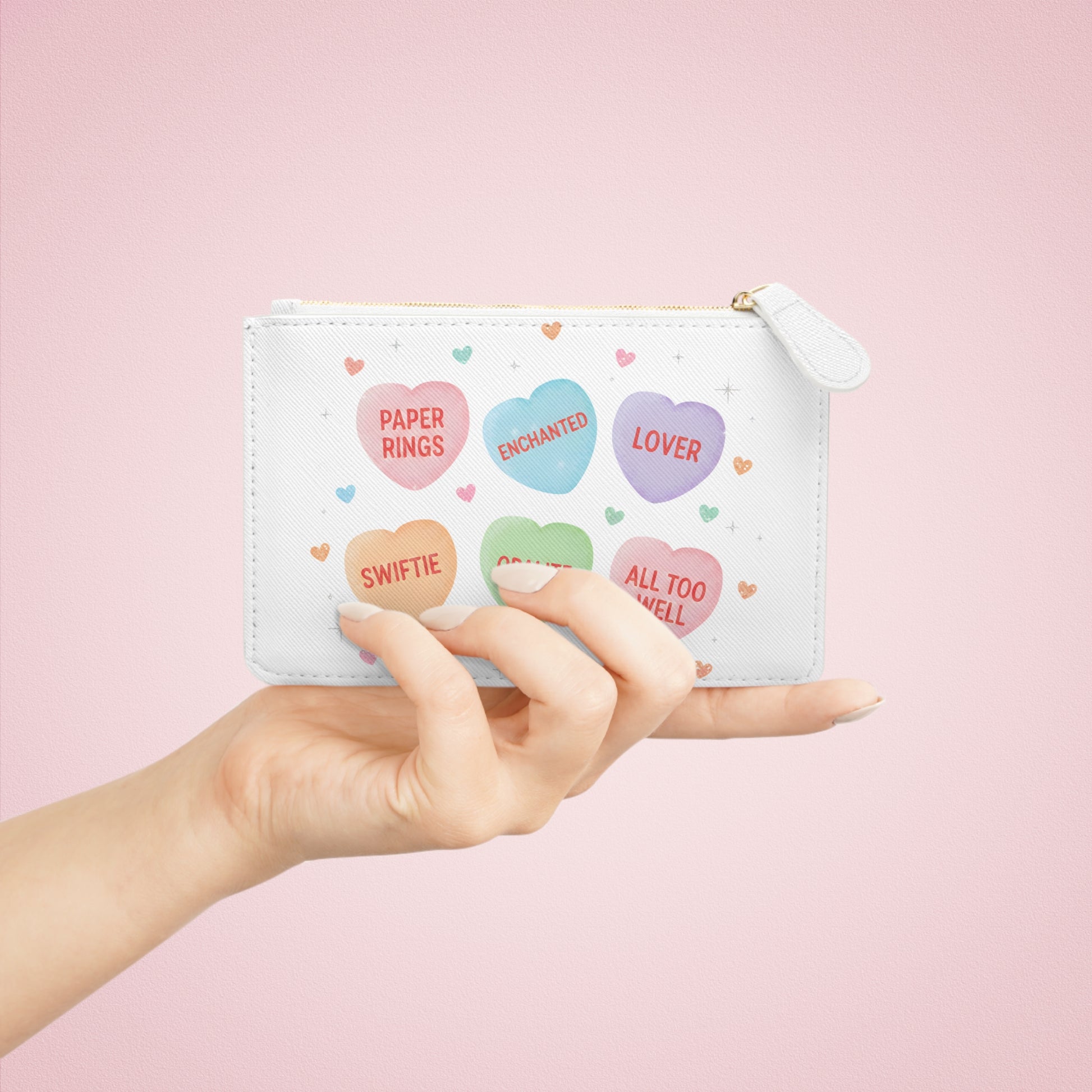 Mini Clutch Bag — Pastel Conversation Hearts Design (Paper Rings, Enchanted, Lover)